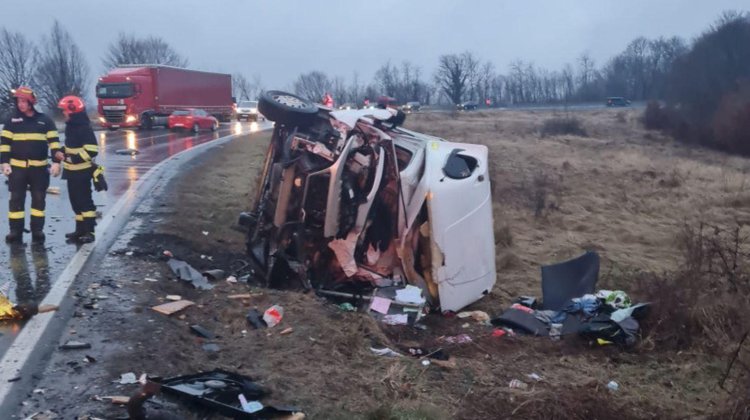 'Polițiștii rutieri din Lugoj au fost sesizați despre producerea unui accident rutier pe DN 6. La fața locului s-a constatat că un bărbat a condus un microbuz dinspre municipiul Caransebeș înspre Lugoj, iar la un moment dat ar fi intrat într-o depășire, iar în încercarea de a reveni pe banda sa a acroșat o cisternă și ulterior a intrat în coliziune cu un TIR, care se deplasa din sensul opus de circulație', arată o informare de presă a Poliției Timiș.
